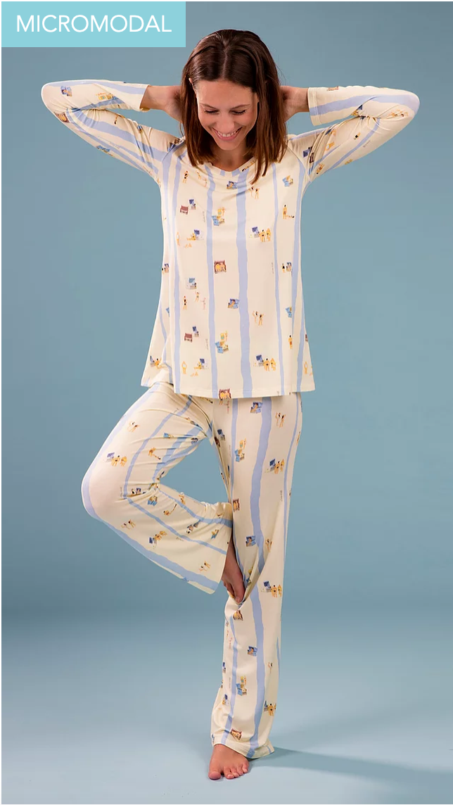 Der Luisa Hill Pyjama im Holiday Design in eleganten Gelb-Blau Tönen ist weich und anschmiegsam, der Rohstoff ist Buchenholz, das Geheimnis der nahezu magischen Weichheit. Alles (<- das Design ;)), der Stoff und die Verarbeitung ist MADE IN AUSTRIA.